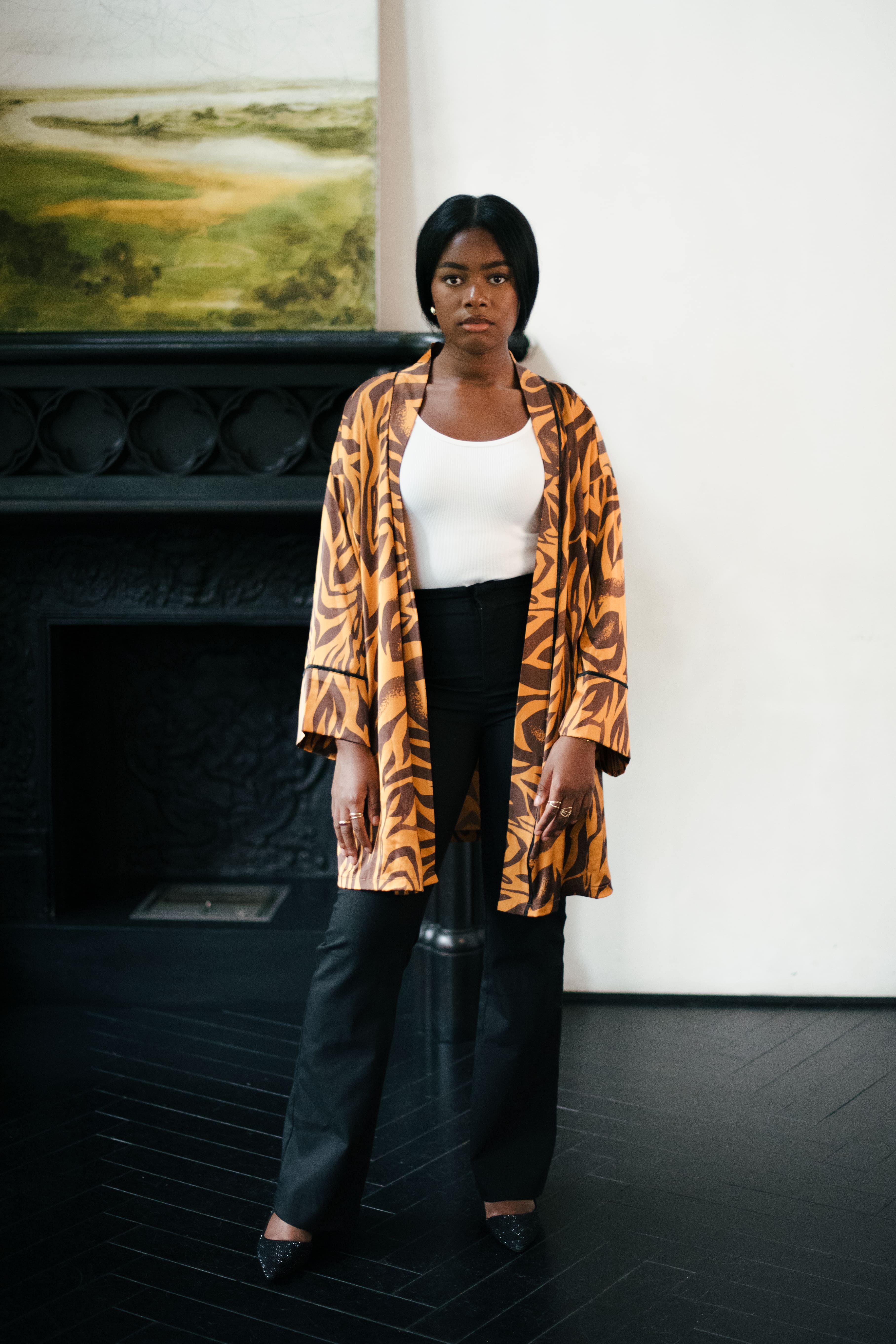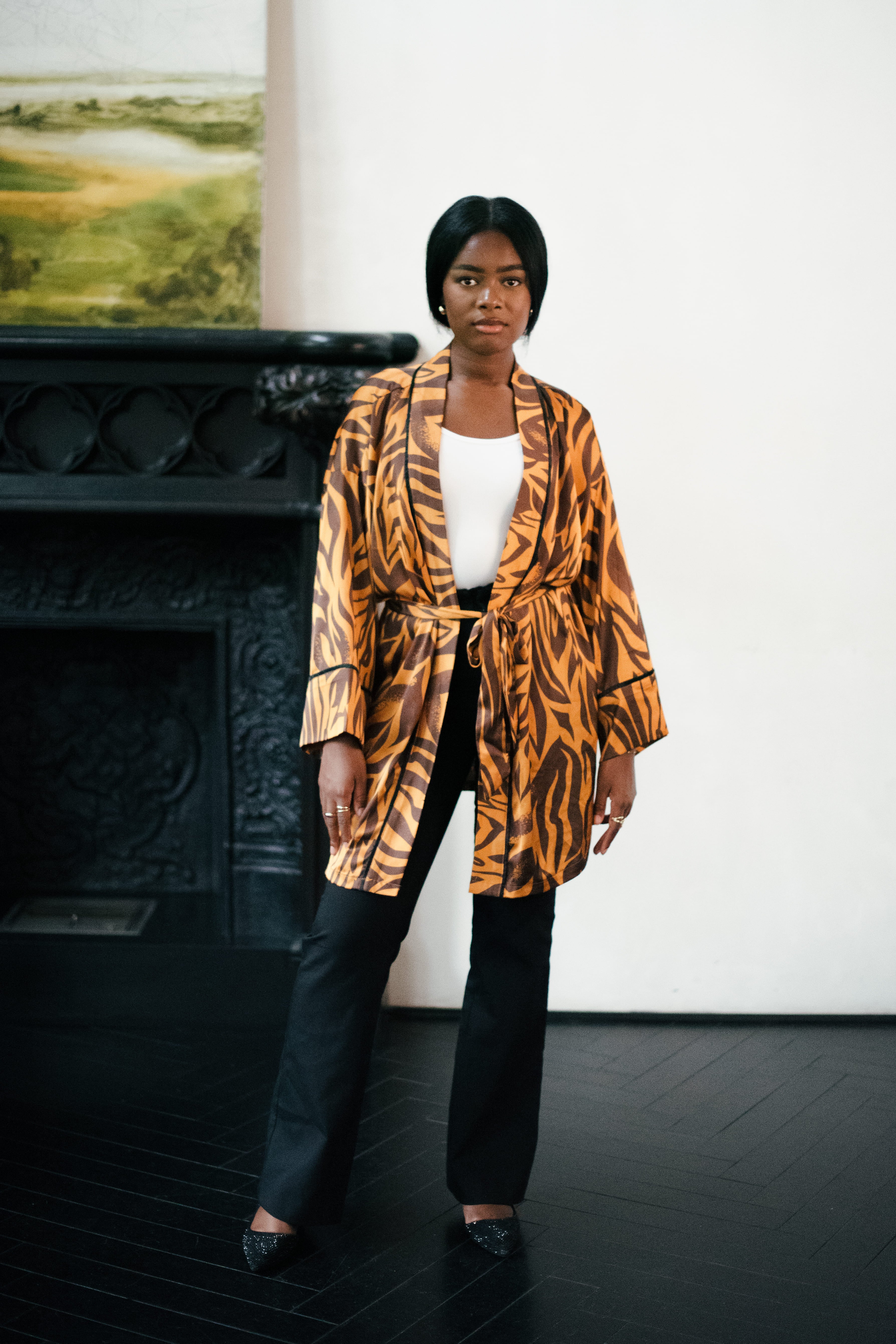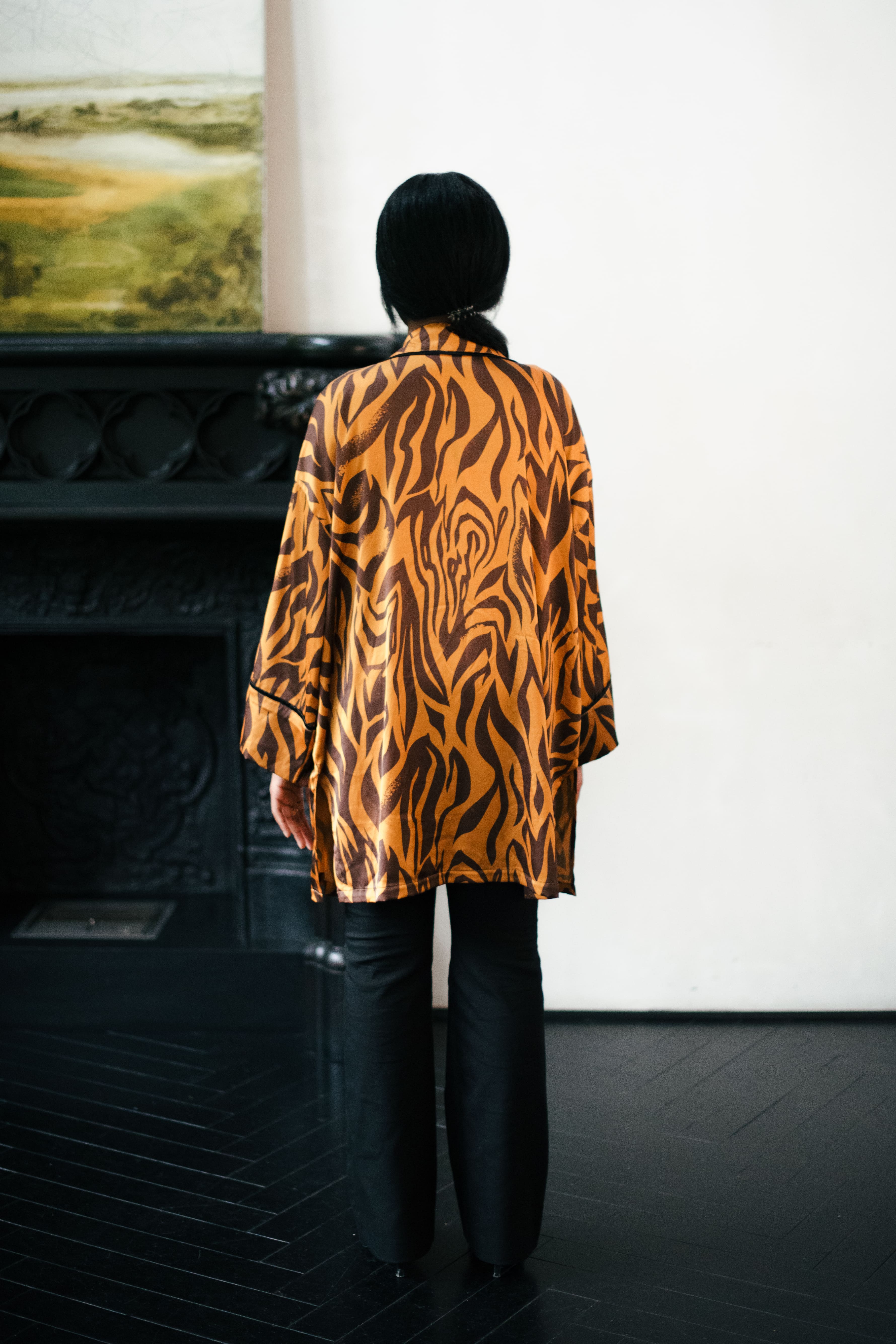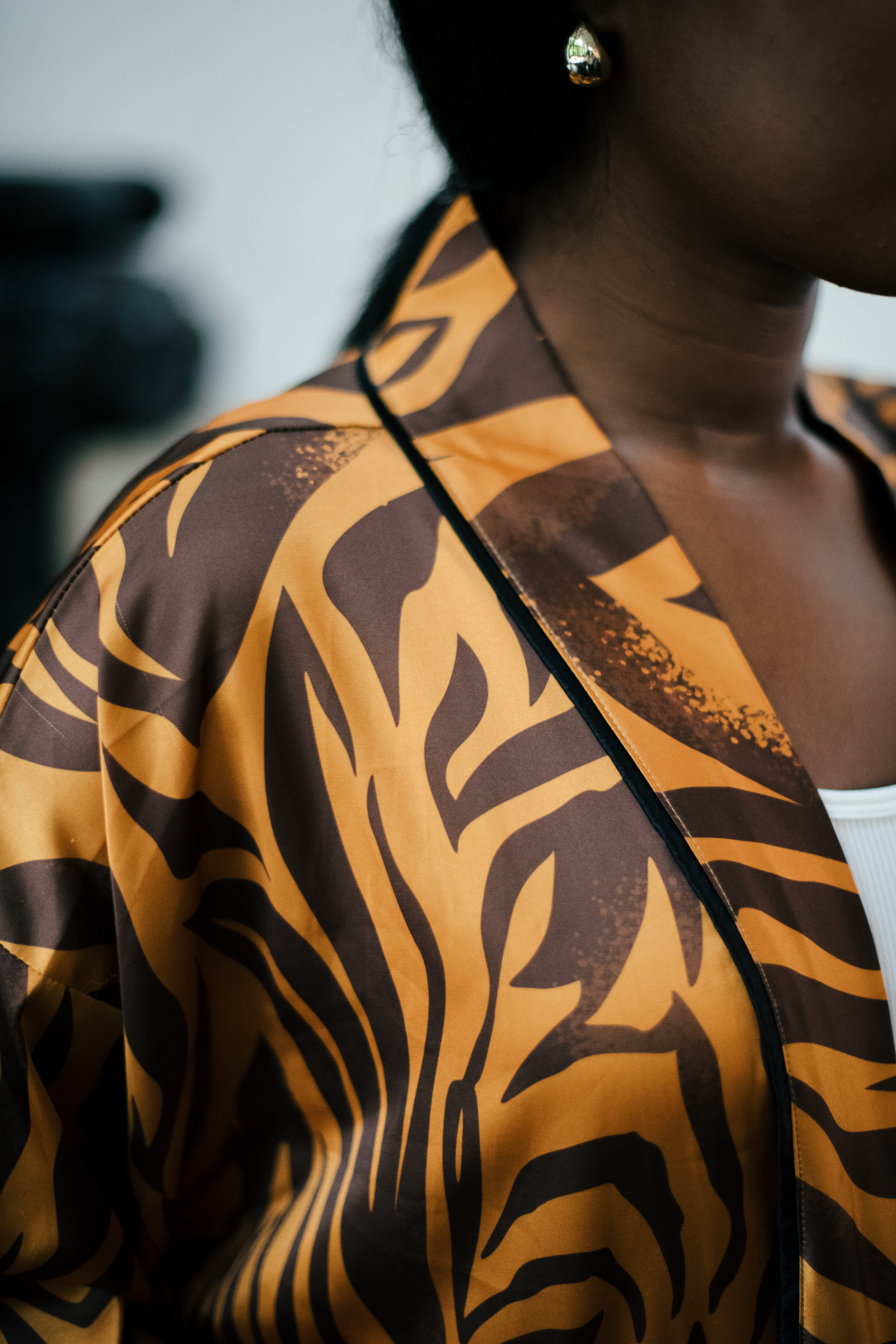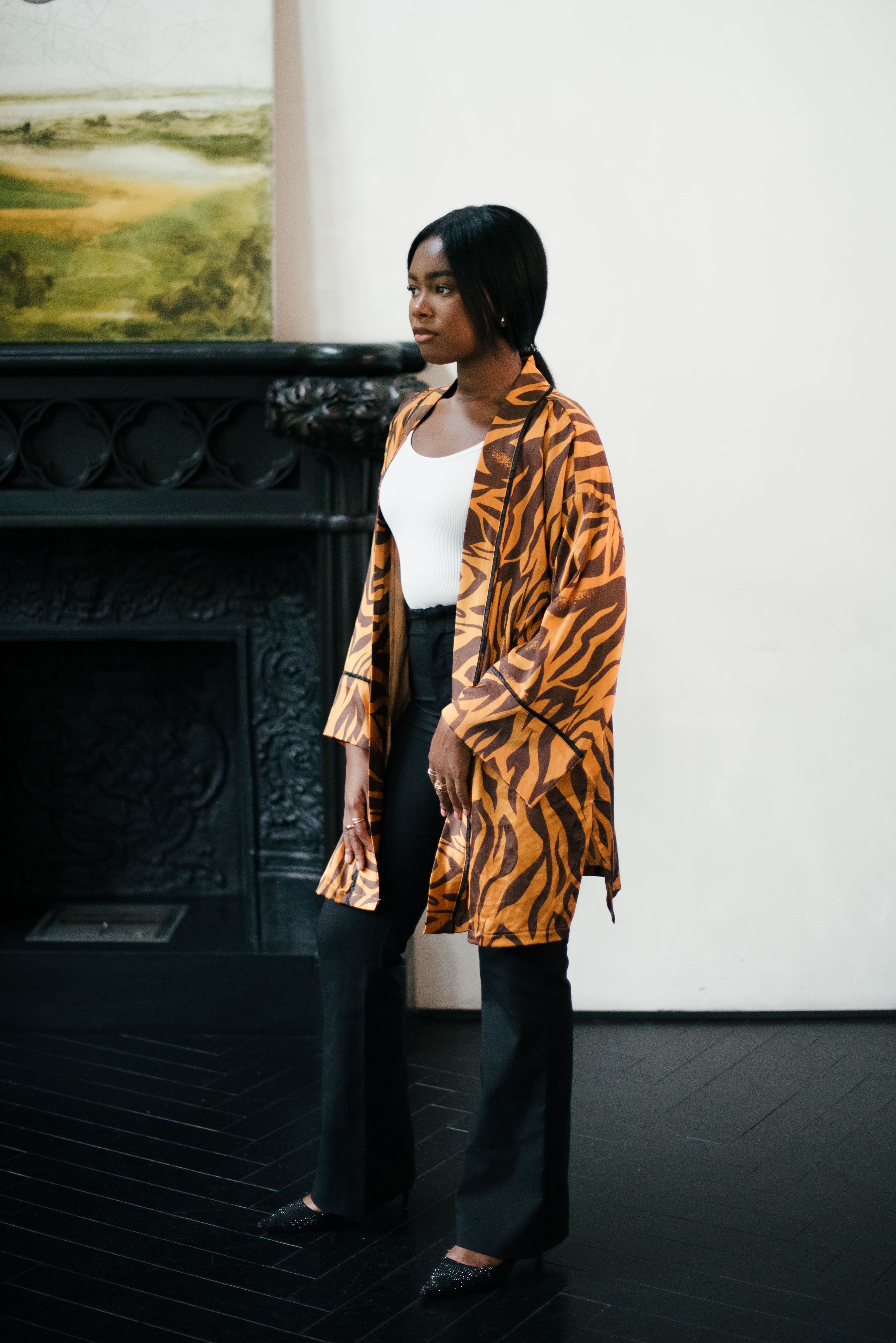 Le kimono Isa, nouvelle pièce de notre collection automne, est à porter loose ou fermé. Ce kimono au motif zébré et orangé se porte en journée comme en soirée.